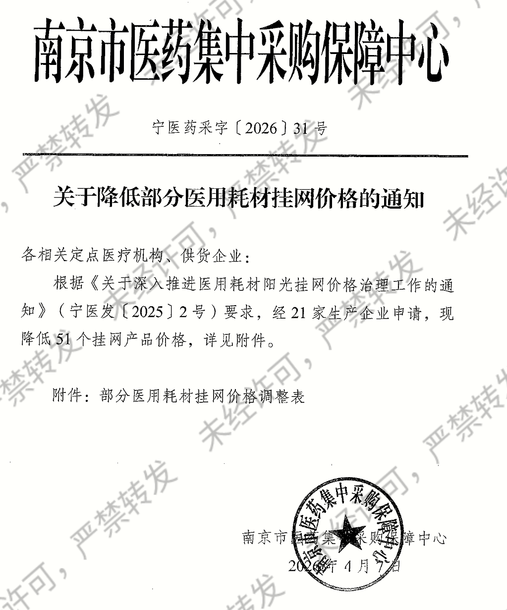 寧醫(yī)藥采字〔2026〕31號—關(guān)于降低部分醫(yī)用耗材掛網(wǎng)價(jià)格的通知