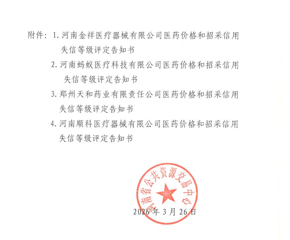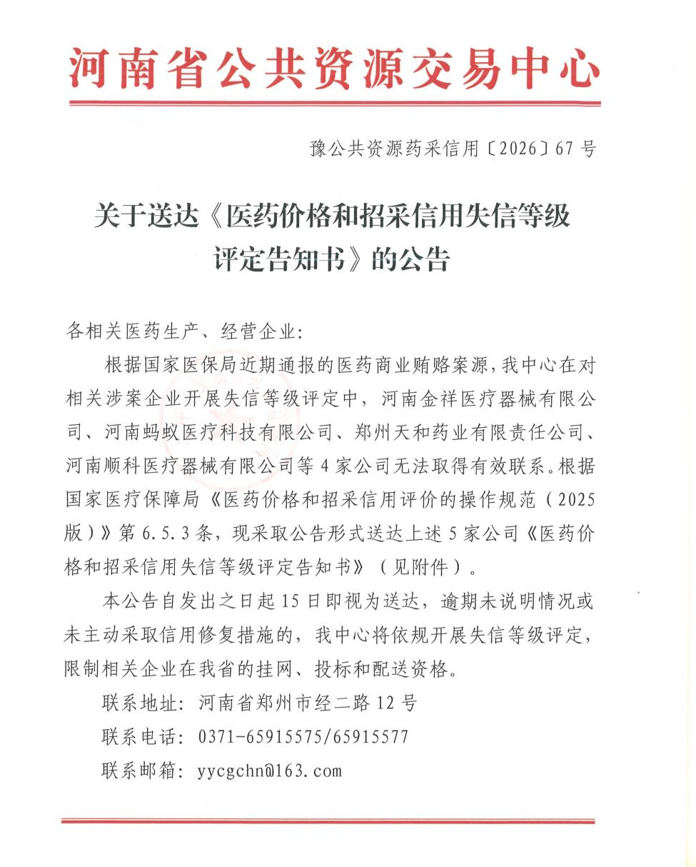 關于送達醫(yī)藥價格和招采信用失信等級評定告知書的公告