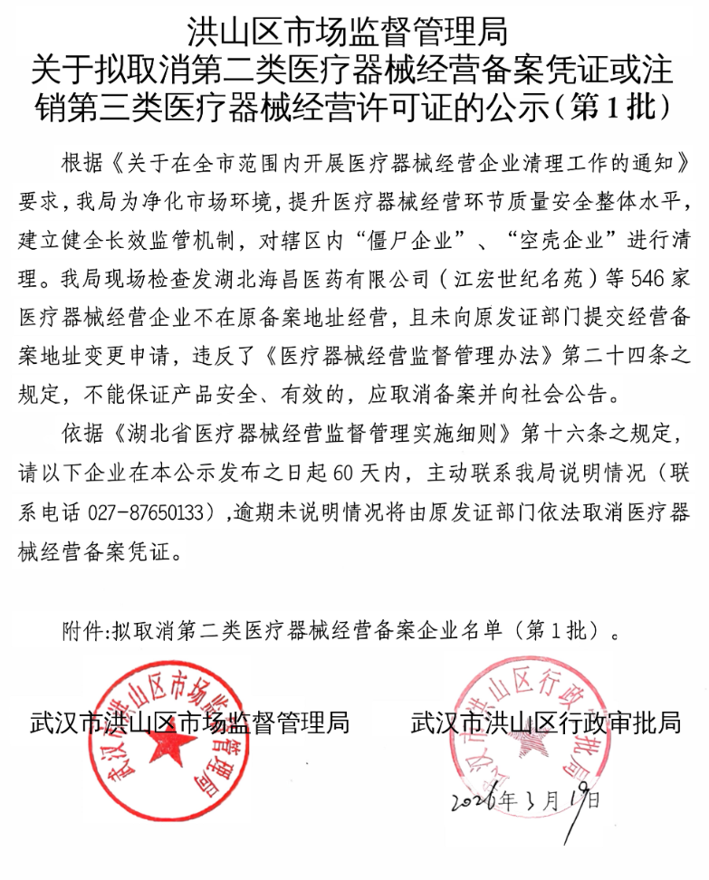 洪山區(qū)市場監(jiān)督管理局關(guān)于擬取消第二類醫(yī)療器械經(jīng)營備案憑證或注銷第三類醫(yī)療器械經(jīng)營許可證的公示(第1批)