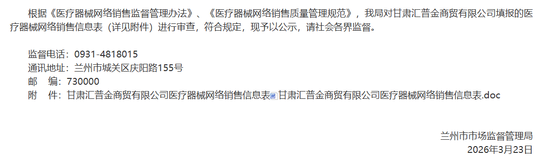 關(guān)于甘肅匯普金商貿(mào)有限公司醫(yī)療器械網(wǎng)絡(luò)銷(xiāo)售備案公告