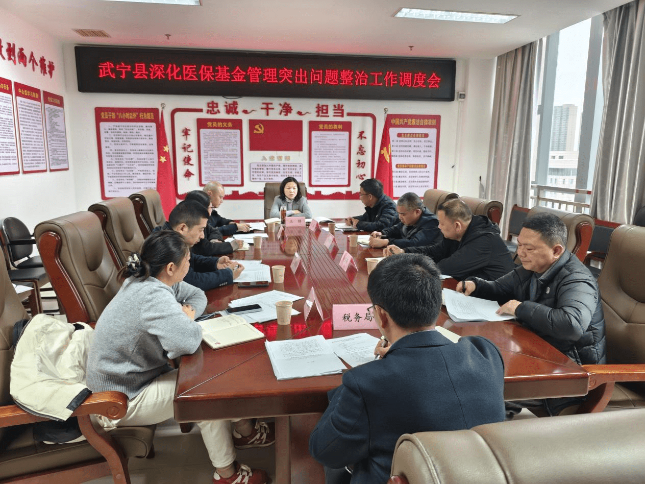 ??? 3月25日下午,武寧縣副縣長王靜主持召開武寧縣深化醫(yī)保基金管理突出問題整治工作調(diào)度會(huì),縣醫(yī)保局、法院、檢察院、公安局、財(cái)政局、衛(wèi)健委、稅務(wù)局、市監(jiān)局等相關(guān)單位負(fù)責(zé)同志參加會(huì)議。