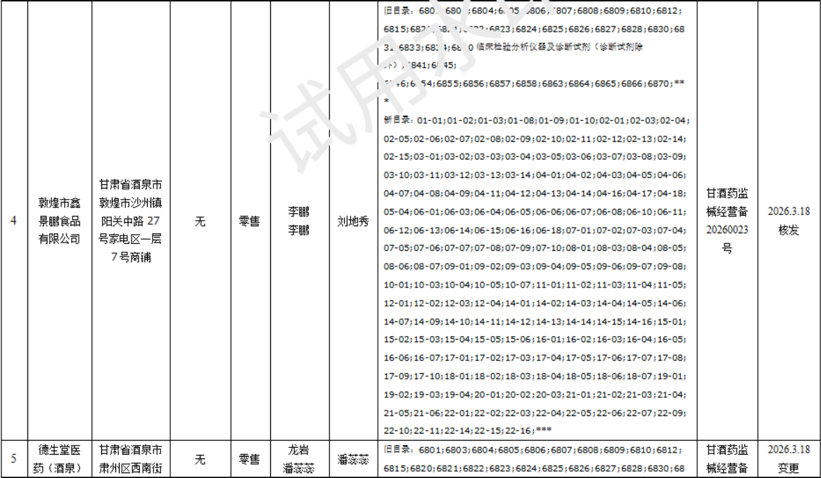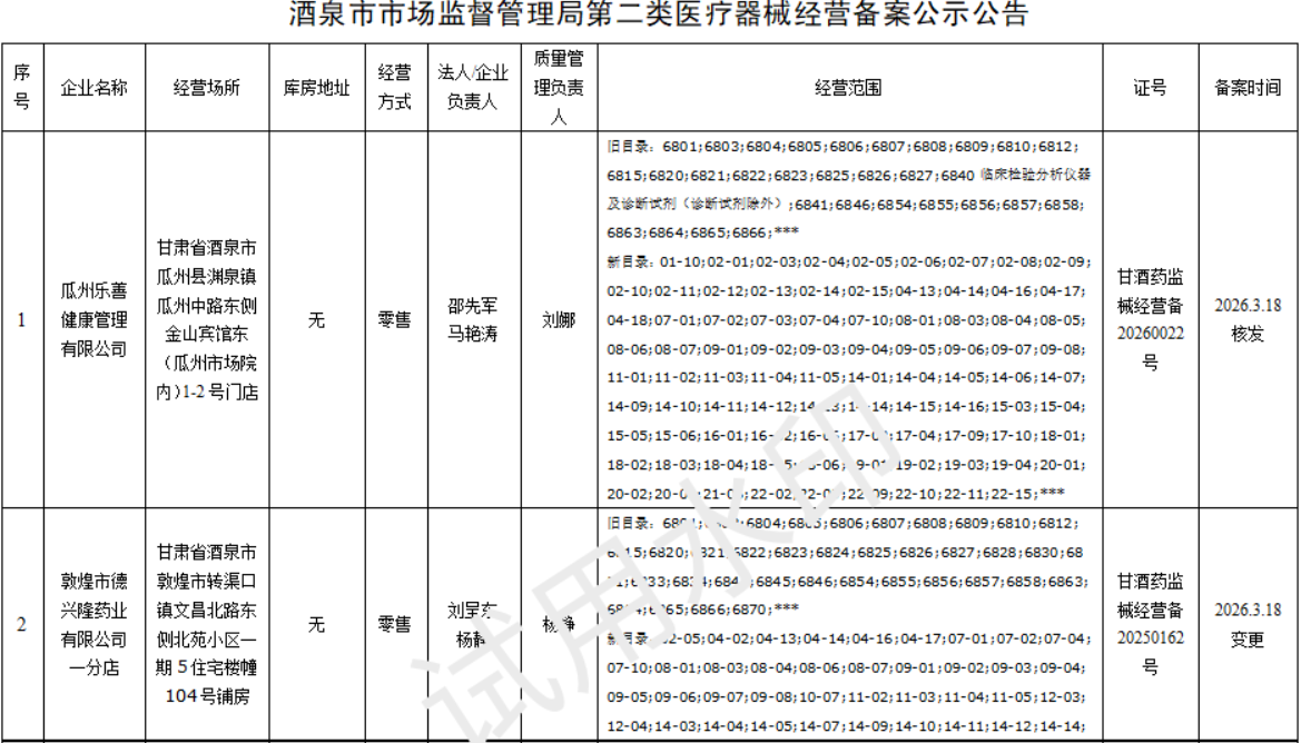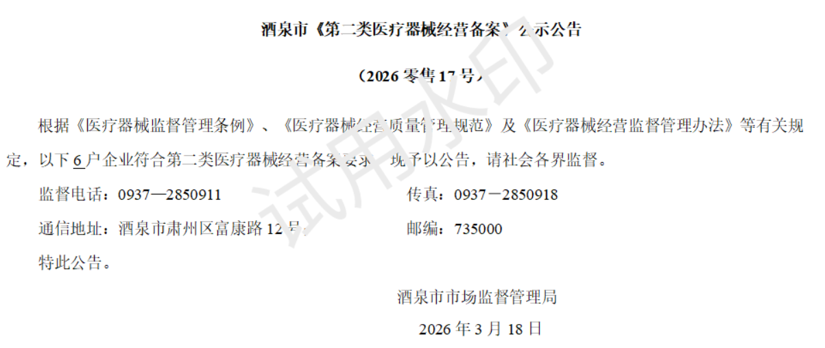 酒泉市《第二類醫(yī)療器械經(jīng)營備案》公示公告(2026零售17號)