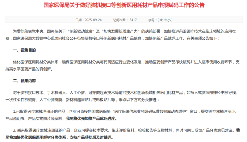 ??? 國(guó)家醫(yī)保局始終旗幟鮮明支持創(chuàng)新藥械高質(zhì)量發(fā)展。針對(duì)腦機(jī)接口這一前沿領(lǐng)域,醫(yī)保部門(mén)提前布局、主動(dòng)謀劃,預(yù)先啟動(dòng)了一系列賦能舉措。2025年3月,印發(fā)神經(jīng)系統(tǒng)醫(yī)療服務(wù)價(jià)格項(xiàng)目立項(xiàng)指南,專(zhuān)門(mén)設(shè)立侵入式、非侵入式腦機(jī)接口相關(guān)價(jià)格項(xiàng)目,為新技術(shù)進(jìn)入臨床應(yīng)用打通收費(fèi)通道。同年9月,面向社會(huì)公開(kāi)征集腦機(jī)接口、手術(shù)機(jī)器人等創(chuàng)新醫(yī)用耗材產(chǎn)品信息,提前開(kāi)展產(chǎn)品賦碼分類(lèi)研究,持續(xù)完善醫(yī)保醫(yī)用耗材分類(lèi)與編碼體系。醫(yī)保政策“先行一步”,為技術(shù)創(chuàng)新加速落地保駕護(hù)航。