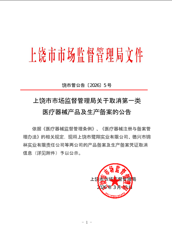 (饒市管公告〔2026〕5號(hào))上饒市市場(chǎng)監(jiān)督管理局關(guān)于取消第一類醫(yī)療器械產(chǎn)品及生產(chǎn)備案的公告