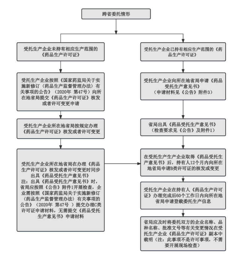 ??為進一步明確藥品委托生產(chǎn)許可有關(guān)事項的辦理程序,確保各省程序規(guī)范統(tǒng)一,《公告》明確了省內(nèi)開展委托生產(chǎn)無需辦理《藥品受托生產(chǎn)意見書》,可同步辦理委托(B類)和受托(C類)藥品生產(chǎn)許可事項。對于跨省委托生產(chǎn)的,明確了“先B后C”的總體辦理原則,即受托生產(chǎn)企業(yè)申請《藥品受托生產(chǎn)意見書》后,先由持有人所在地省局辦理B類藥品生產(chǎn)許可事項,之后受托生產(chǎn)企業(yè)所在地省局再根據(jù)持有人所在地省級藥品監(jiān)督管理部門審批情況,將委托生產(chǎn)的詳細信息登載到受托生產(chǎn)企業(yè)《藥品生產(chǎn)許可證》副本中。對于尚未持有相應(yīng)生產(chǎn)范圍《藥品生產(chǎn)許可證》的情形,《公告》明確應(yīng)當先按照《國家藥監(jiān)局關(guān)于實施新修訂〈藥品生產(chǎn)監(jiān)督管理辦法〉有關(guān)事項的公告》(2020年第47號)規(guī)定辦理C類藥品生產(chǎn)許可,同步辦理《藥品受托生產(chǎn)意見書》,之后再按照“先B后C”順序辦理,具體流程參見下圖: