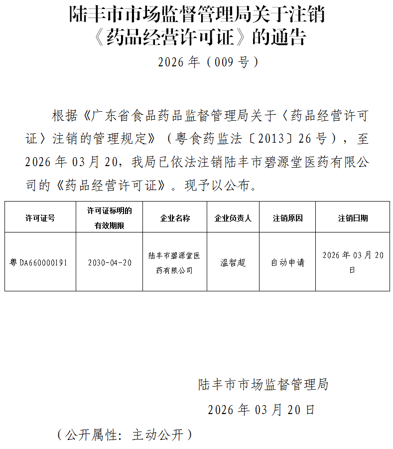 陸豐市市場(chǎng)監(jiān)督管理局關(guān)于注銷《藥品經(jīng)營(yíng)許可證》的通告