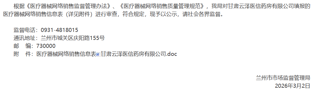 關(guān)于甘肅云澤醫(yī)信藥房有限公司醫(yī)療器械網(wǎng)絡銷售備案公告