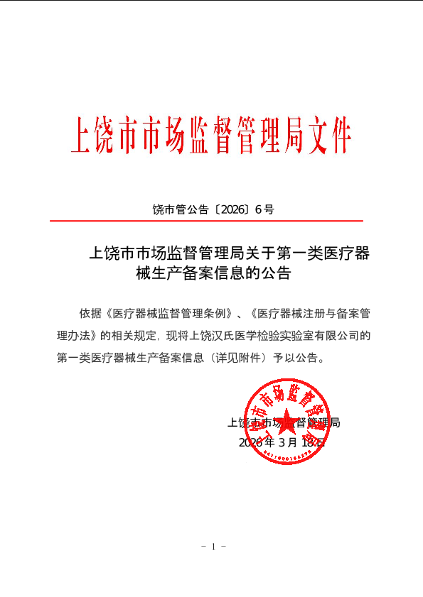 (饒市管公告〔2026〕6號)上饒市市場監(jiān)督管理局關(guān)于第一類醫(yī)療器械生產(chǎn)備案信息的公告
