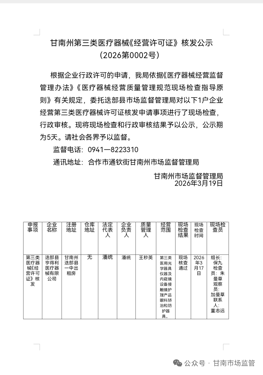 甘南州第三類醫(yī)療器械《經(jīng)營許可證》核發(fā)公示(2026第0002號)